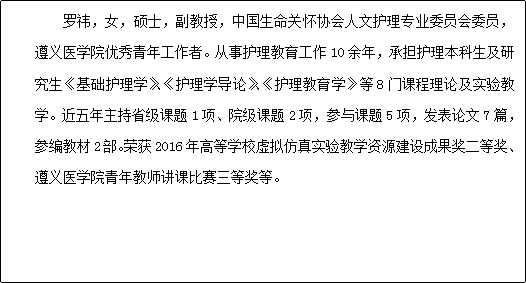 姓名:罗祎 学历:硕士研究生 职称:副教授 所属专业:护理学