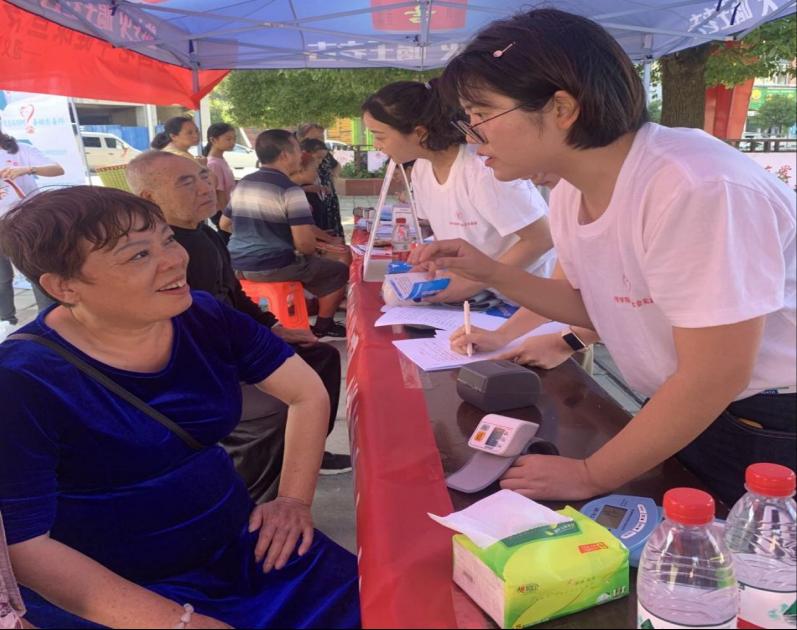 “莫道桑榆晚,人间重晚晴”养老科普实践小分队为老年人测量血压,进行慢性病管理、预防跌倒等健康知识宣教。