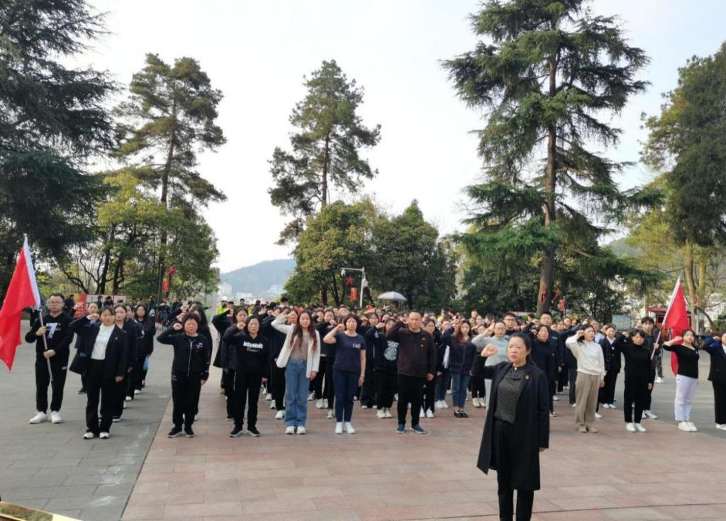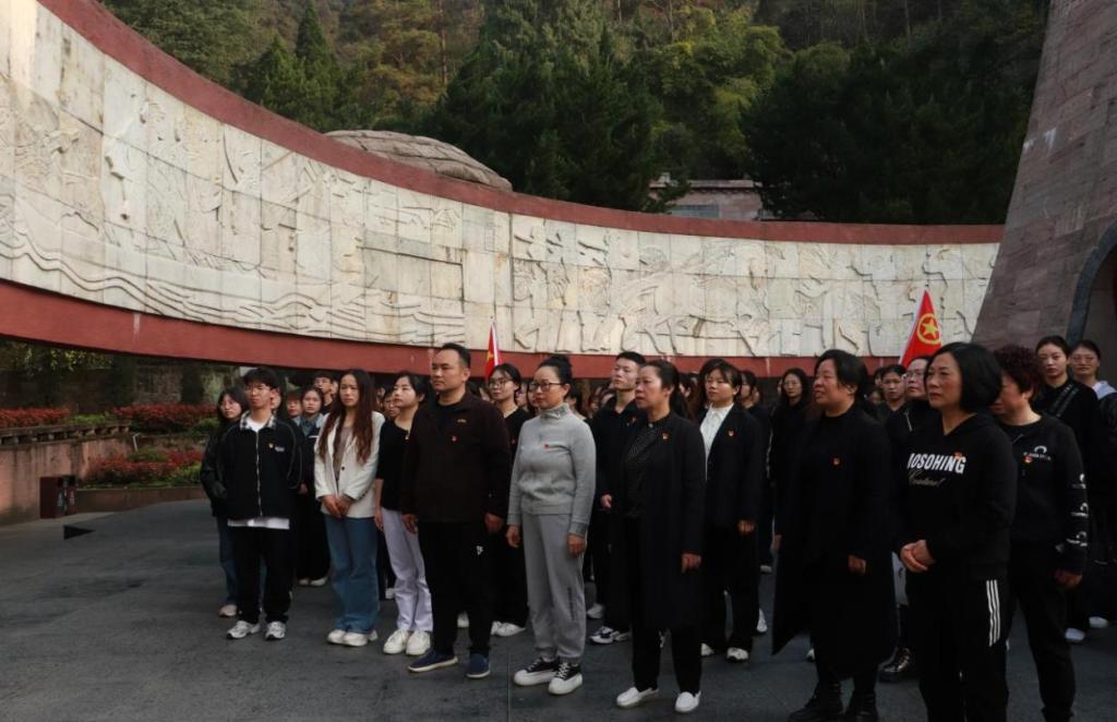 缅怀革命先烈,赓续红色血脉。上午7:20,在党委书记张咏梅、党委副书记陈伟的带领下,师生一行从大连路校区出发,迈着坚定的步伐,朝着红军山纪念广场拾级而上,到达遵义红军烈士陵园。途中,张咏梅书记向师生讲述红军长征在遵义的故事,引导同学们深刻理解遵义会议精神的内涵。在遵义红军烈士陵园,全体师生满怀敬意向英雄烈士们敬献花篮,张咏梅书记和邓仁丽经理向前整理挽联,全体师生肃立默哀、鞠躬,表达对革命先烈的崇敬之意和悼念之情。随后,在张咏梅书记的带领下,党员们高举右手,重温了入党誓词。全体师生在讲解员的生动讲解下瞻仰了红军烈士陵园,深切感受英雄们的英勇事迹和丰功伟绩,接受红色教育的洗礼。