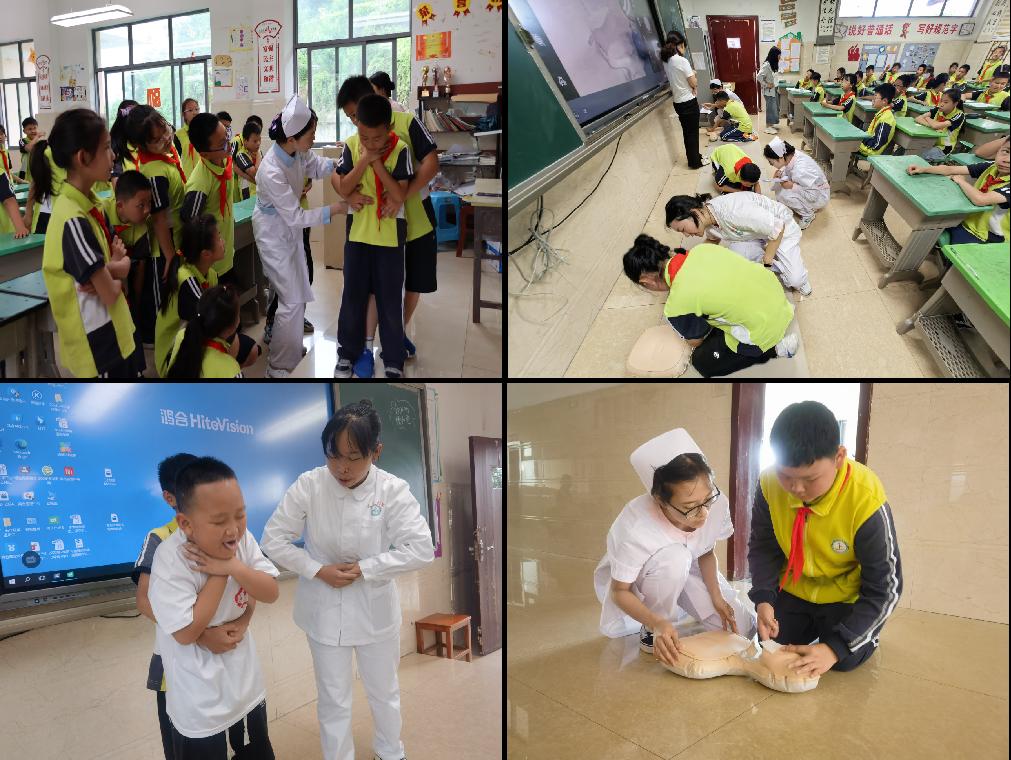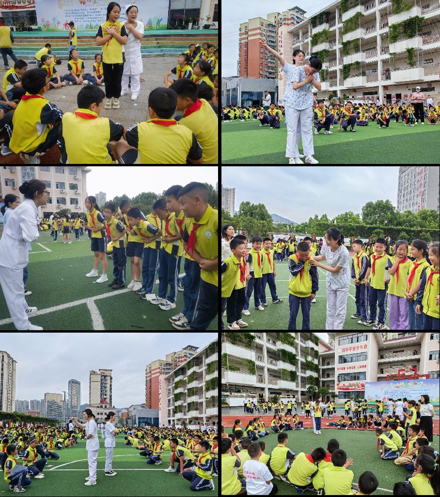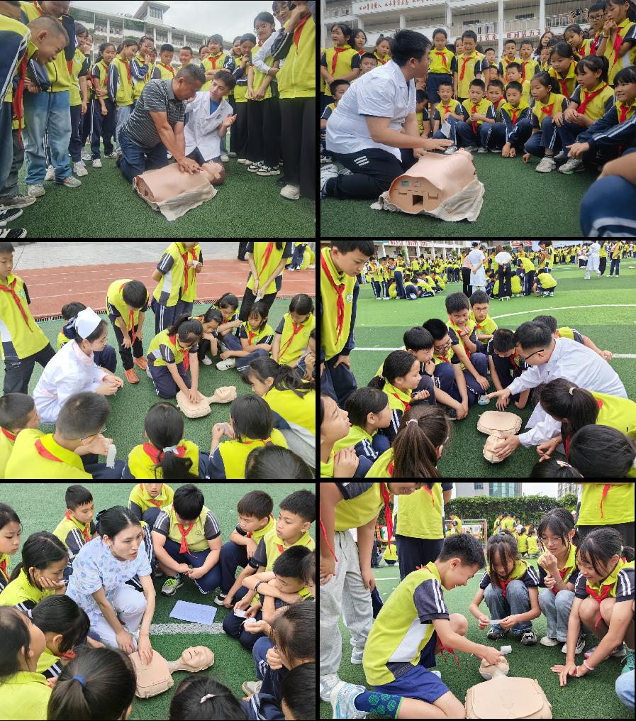 急救知识进校园,守护生命伴成长。仪式结束,学院师生分别在操场、教室采用“理论讲解+模拟示范+操作体验”的方式进行急救知识培训。针对三、四年级员工,师生们用通俗易懂的语言结合动作示范讲解了海姆立克急救法,如何用“剪刀-石头-布”的方法确定位置,如何以正确的操作冲击患者腹部直至排出异物,并指导700余员工完成操作体验。针对五、六年级员工,师生们讲解了什么是急救“黄金四分钟”,并借助人体模型演示了心肺复苏的操作步骤,600余名师生积极参与模拟演练,对于按压姿势、按压位置等问题均一一指导。