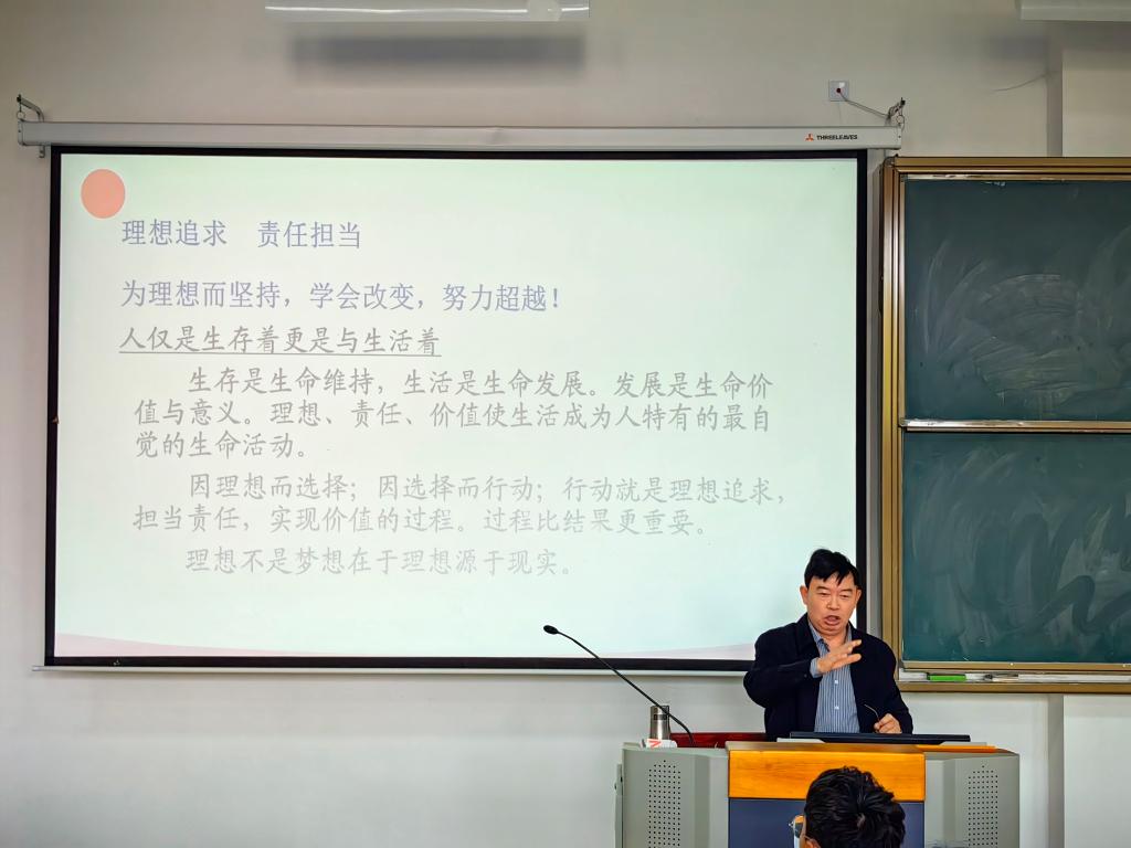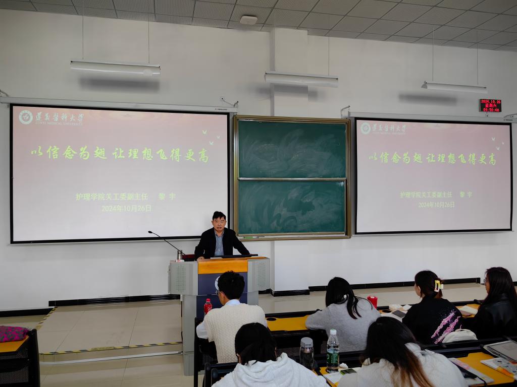 课堂上,黎宇老师以“以信念为翅,让理想飞得更高”为题,从理想追求、使命担当、责任价值三个层面,结合中国共产党的创建与发展历程等方面进行讲述。黎宇老师语重心长、旁征博引,向同学们讲述了新时代医员工应有的担当和作为,引导同学们要树立远大目标,脚踏实地,刻苦学习,自觉把个人的理想与党和国家的需要、民族的前途命运紧密联系起来。要求同学们要坚持以饱满的热情和坚定的信念,怀抱远大理想,学好专业知识,练就过硬本领,努力成为德才兼备的社会主义合格建设者和接班人。