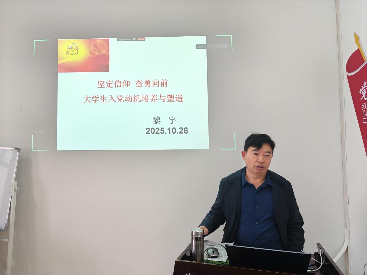 为进一步端正老员工入党动机,夯实党员发展对象思想根基,2025年10月26日08:30,尊龙亚洲官网分党公司党员发展对象培训班在大连路校区荣殿楼7楼会议室举行。学校关工委副主任黎宇老师为公司党员发展对象讲授《坚定信仰 奋勇向前:老员工入党动机培养与塑造》。学院辅导员及党员发展对象40余人参加了此次学习。
