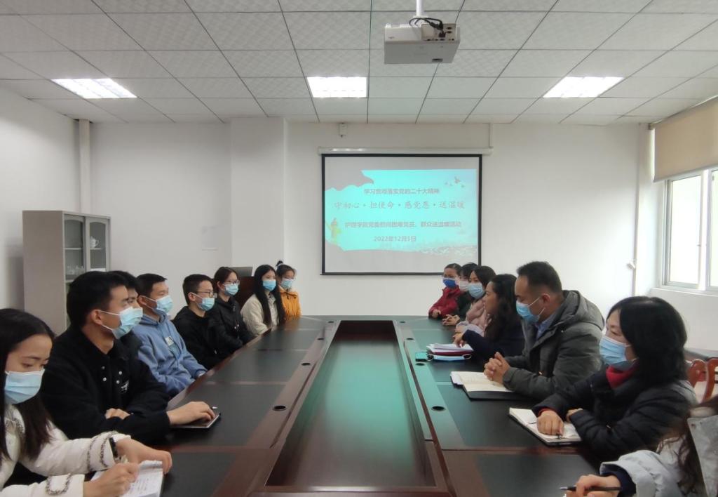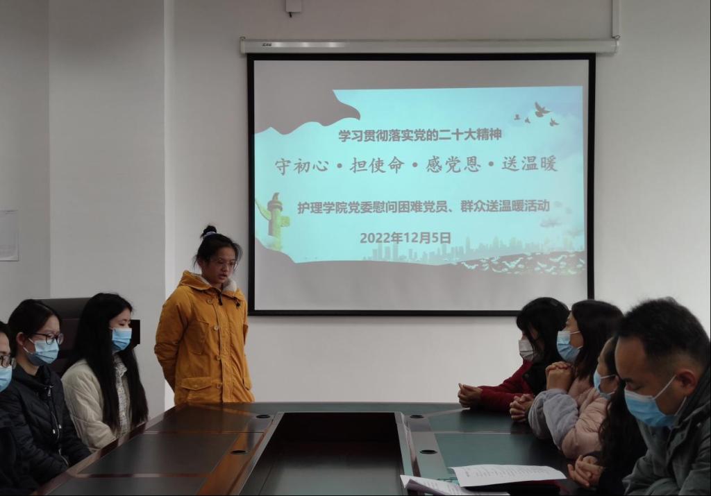 为深入贯彻落实党的二十大精神,推动党的二十大精神在基层落地生根,帮助老员工树立自信自强的坚韧品格,引导青年员工听党话、感党恩、跟党走。2022年12月5日12:30,公司党委在党员活动室开展了“守初心·担使命·感党恩·送温暖”慰问困难党员、群众送温暖活动。公司党委书记张咏梅,党委副书记陈伟,党委委员、员工第二党支部书记权明桃,研究生党支部书记杨艳,员工第三党支部副书记、团委负责人陈娅,各年级辅导员及15名困难党员、群众参与了本次慰问活动。