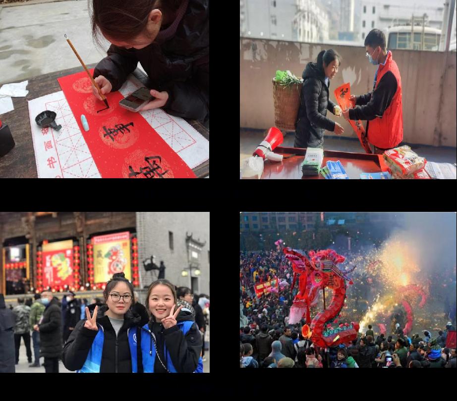 以春节为契机,大力弘扬中华优秀传统文化,坚定民族文化自信。志愿者们积极参与家乡具有浓郁地域特色和时代气息的年俗活动,深入村居社区写春联、送福字、维护秩序等志愿服务,进一步激发爱党、爱国、爱社会主义的热情。
