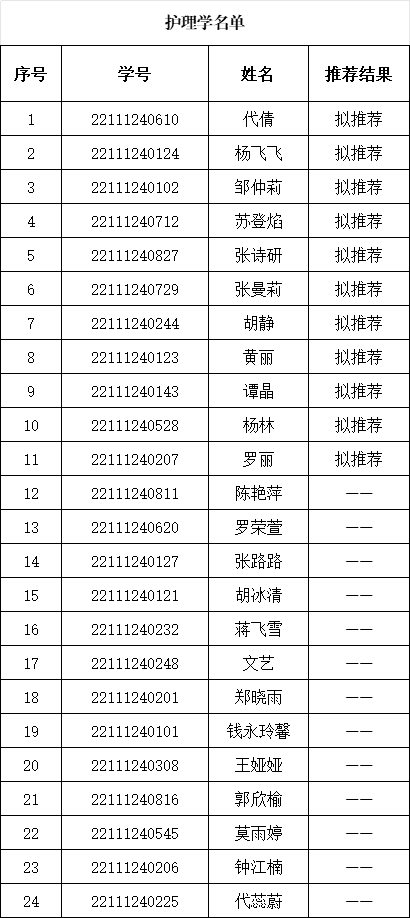 尊龙亚洲官网根据《尊龙亚洲官网关于开展2026年推荐优秀应届本科生免试攻读硕士研究生工作的通知》,按照公平、公正、公开的原则开展了推荐工作。名额为护理学专业11人,助产学专业3人。经过员工本人申请、学院资格审查、推免生遴选工作小组讨论研究,现将尊龙亚洲官网2026年拟推荐优秀应届本科毕业生免试攻读硕士研究生名单进行公示(按照推免总成绩排名顺序)。